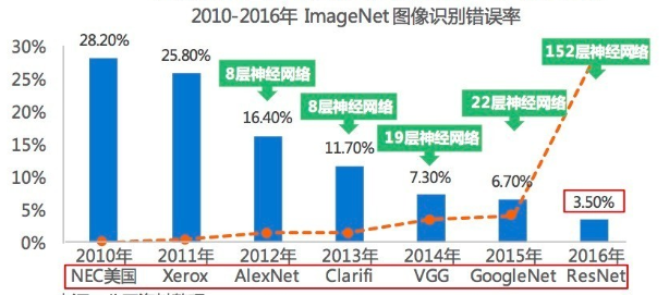 技術(shù)驅(qū)動(dòng)階段集中誕生了基礎(chǔ)理論、基本規(guī)則和基本開發(fā)工具。在此階段,算法和計(jì)算力對(duì)AI的發(fā)展起到主要推動(dòng)作用。現(xiàn)在主流應(yīng)用的基于多層網(wǎng)絡(luò)神經(jīng)的深度算法,一方面不斷加強(qiáng)從海據(jù)庫中自行歸納物體特征的能力,一方面不斷加強(qiáng)對(duì)新事物多層特征提取、描述和還原的能力。對(duì)算法來說,歸納和演繹同樣重要,最終目的是提高識(shí)別效率。最新ImageNet測(cè)試結(jié)果顯示,AI錯(cuò)誤率低達(dá)3.5% ,而人類對(duì)同一數(shù)據(jù)庫識(shí)別錯(cuò)誤率在5.1%,理想情況下,計(jì)算機(jī)圖像識(shí)別能力已超越人類。